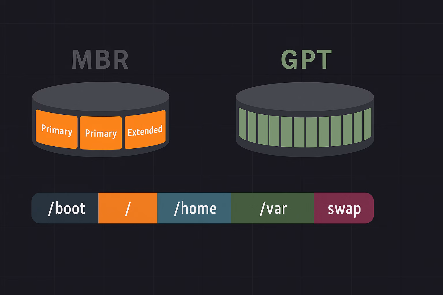 Ein sauberes Festplatten-Layout ist die Grundlage für ein stabiles Linux-System. Schon vor der Installation muss entschieden werden, welche Partitionen notwendig sind und wie Speicherplatz aufgeteilt wird. Dieses Kapitel behandelt die Konzepte hinter Partitionen, Mountpoints und die Unterschiede zwischen MBR und GPT.